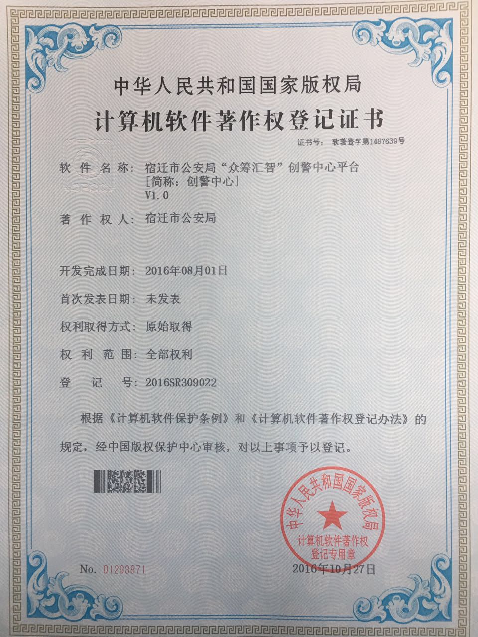 近日,由我司同宿遷市公安局自主研發(fā)的宿遷市公安局“眾籌匯智”創(chuàng)警中心平臺成功獲得軟件著作權(quán)登記證書。 市局研發(fā)的創(chuàng)警中心平臺為國內(nèi)首次發(fā)布,系市局首個自主開發(fā)、擁有自主版權(quán)的計算機(jī)軟件。此次軟件著作權(quán)的取得,對外展示了我...