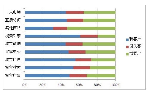 從上述圖表中,我們可以看到賣家一周內(nèi)的新客戶、回頭客、老客戶都是從不同的來(lái)源進(jìn)入網(wǎng)店的。或許因搜索排名、口碑、品牌、商品展示等因素影響了消費(fèi)者的首次購(gòu)買行為。細(xì)心的朋友會(huì)發(fā)現(xiàn),在上表中,回頭客、老客戶是店鋪流量的主力軍,但他們的來(lái)源又各不一樣,從其他網(wǎng)站、商城、直接訪問、買家中心來(lái)的老顧客占得較多,而且質(zhì)量也比較高。