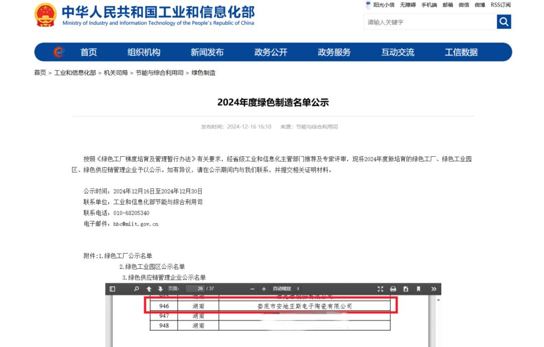 在可持續(xù)發(fā)展浪潮澎湃的當(dāng)下,工業(yè)領(lǐng)域的綠色轉(zhuǎn)型成為時(shí)代的必答題。近日,工業(yè)和信息化部公布了《2024年度綠色制造名單》,安地亞斯憑借在綠色制造領(lǐng)域的卓越表現(xiàn),榮獲“國(guó)家級(jí)綠色工廠”稱號(hào),此榮譽(yù)是公司在綠色制造領(lǐng)域首創(chuàng)突破,更是為電子陶瓷行業(yè)樹立了新標(biāo)桿。